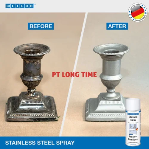 WEICON Stainless Steel Spray is a surface coating based on acrylic resin and stainless steel pigments and resistant to chemicals, corrosion and weather. It is temperature-resistant up to +300 °C (+572 °F) for a short period of time. Stainless Steel Spray can be used wherever a resistant and effective protective layer is required. The alloy is comprised of chromium, nickel and manganese, amongst others. WEICON Stainless Steel Spray can be used to repair damaged stainless steel parts on truck bodies, silos and pipelines, and outdoor applications. It can also be used for decorative purposes and for the optical refinement of glass, wood, stone, ceramics and most plastics.