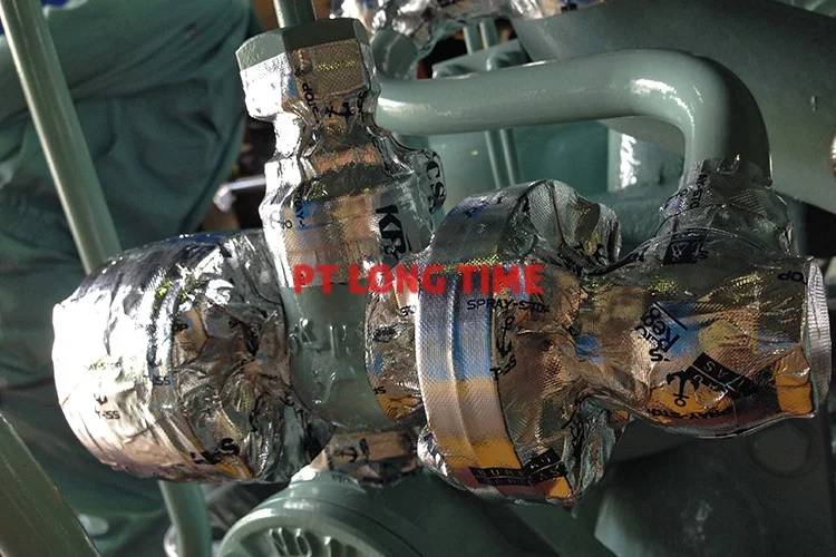 Spray Stop Standard and Spray Stop 50+ anti-splash tape is used for applications in the marine & offshore industry. This high-tech laminated multilayer aluminium tape, has been designed by safety specialists in order to prevent spray outs of hazardous liquids (oil / fuel) from tubing systems. These liquids can cause extremely dangerous situations like fires, explosions or other dangerous situations. According to the SOLAS amendment chapter 2-2 regulation, ships are to apply appropriate protection system to prevent leakage and splashing of flammable oil from FO, LO hydraulic and other piping systems.